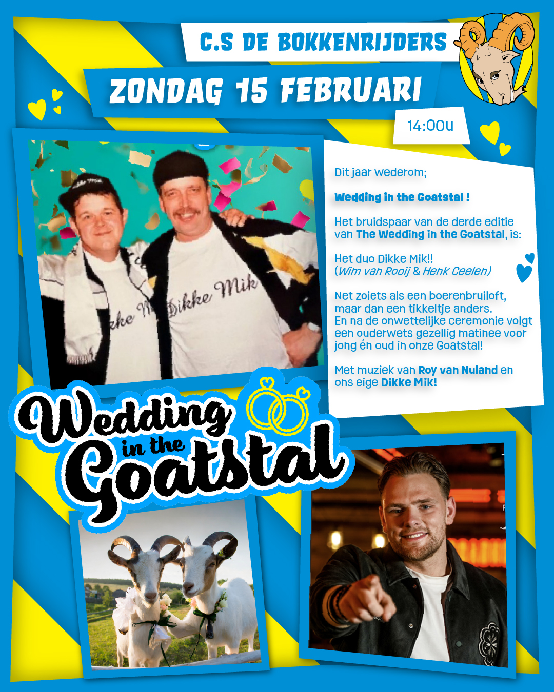 Net zoiets als een boerenbruiloft, maar dan een tikkeltje anders. En na de onwettelijke ceremonie volgt een ouderwets gezellig matinee voor jong én oud in onze Goatstal!