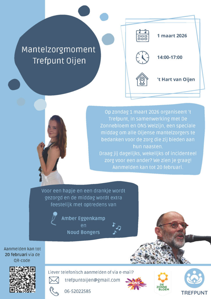 Mantelzorgmoment Trefpunt Oijen Op zondag 1 maart 2026 organiseert ’t Trefpunt, in samenwerking met De Zonnebloem en ONS Welzijn, een speciale middag om alle Oijense mantelzorgers te bedanken voor de … Meer lezen over Mantelzorgmoment Trefpunt Oijen