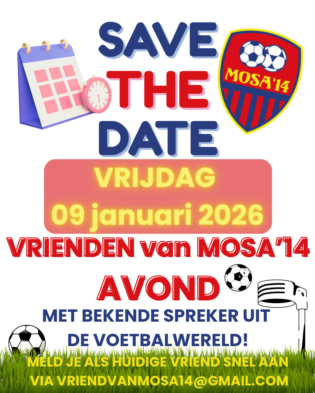 Ben jij nog geen vriend van MOSA’14, meld je dan nu alsnog aan. (Het eerste seizoen kost je 50 euro, daarna 40euro.) Dan pak jij deze avond met een bekende voetbal spreker mee! Om je aan te melden stuur je een mail naar vriendvanmosa14@gmail.com met je voor-, achternaam en telefoonnummer.