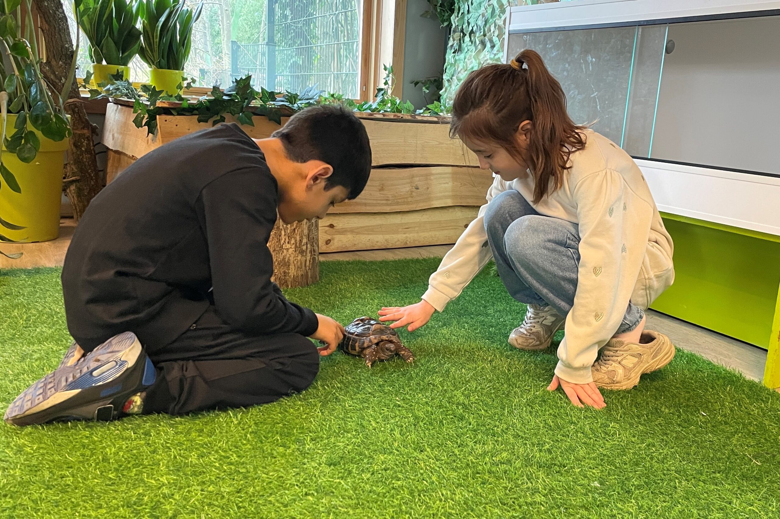 En natuurlijk worden er tijdens de les ook een aantal dieren vastgehouden of geaaid. Zo mogen de kinderen, als ze durven, een echte koningspython aanraken, een slak over hun hand laten lopen of een wandelende tak over hun arm laten kriebelen.