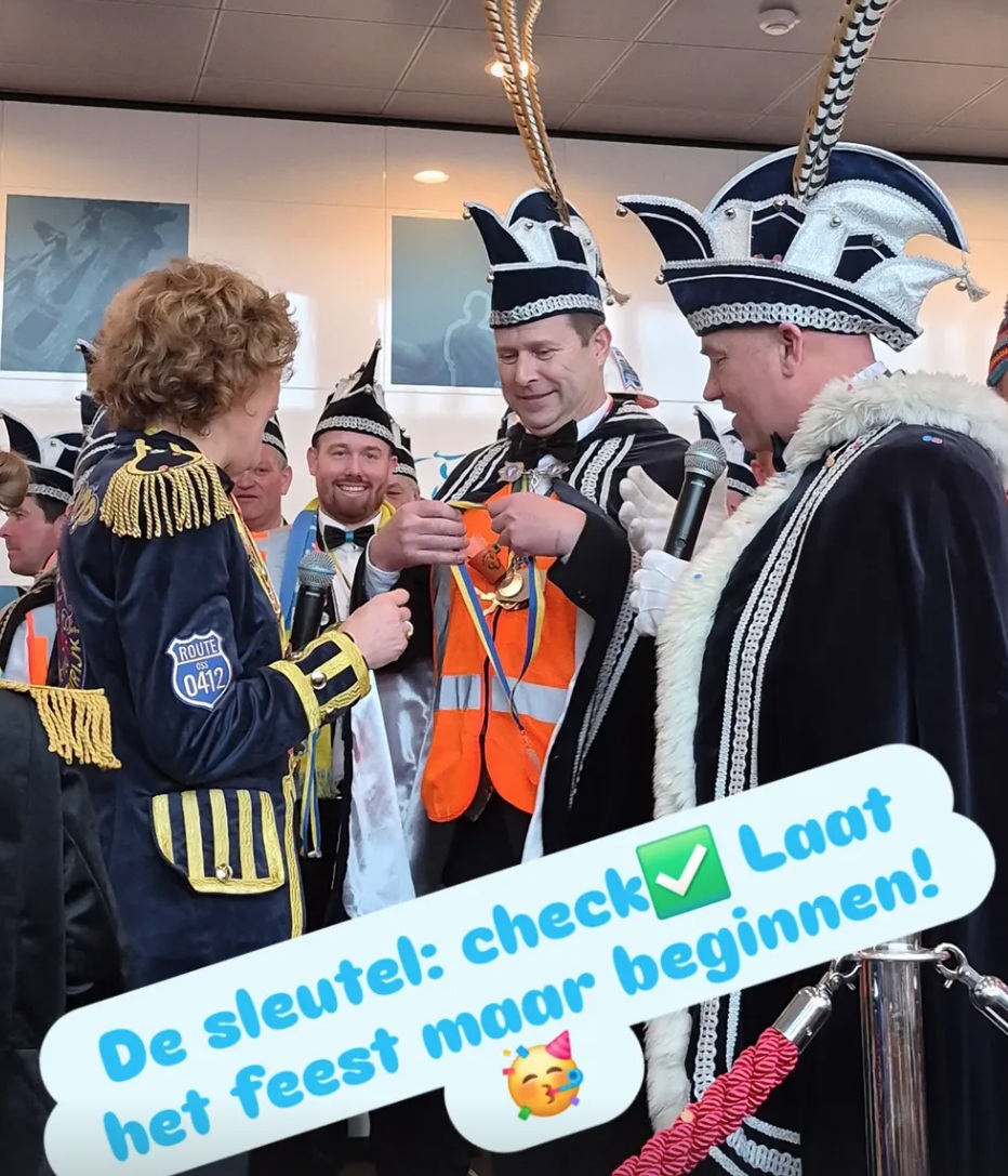 Ook prins Barry d’n Urste was samen met zijn gevolg uit Oijen van de partij. In vol ornaat (inclusief veiligheidsvest van Waterschap Aa en Maas) en met een flinke dosis enthousiasme liet hij zien dat Oijen er helemaal klaar voor is om de komende dagen volop carnaval te vieren.