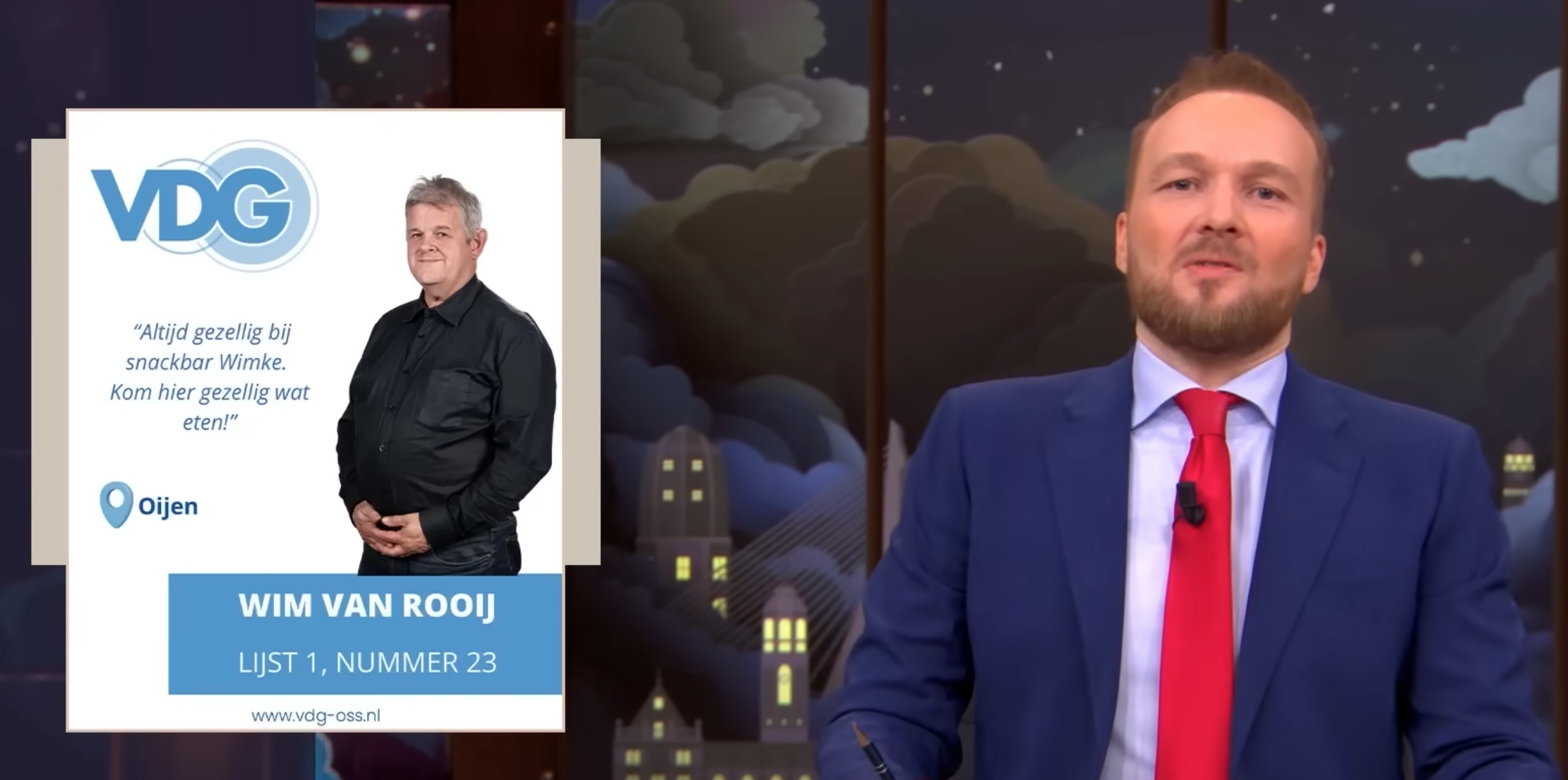 Geen politiek statement of vage kreet op een verkiezingsposter, maar een uitnodiging om te komen eten. ‘Altijd gezellig bij snackbar Wimke. Kom hier gezellig wat eten!’ is te lezen op de poster van Wim van Rooij uit Oijen.